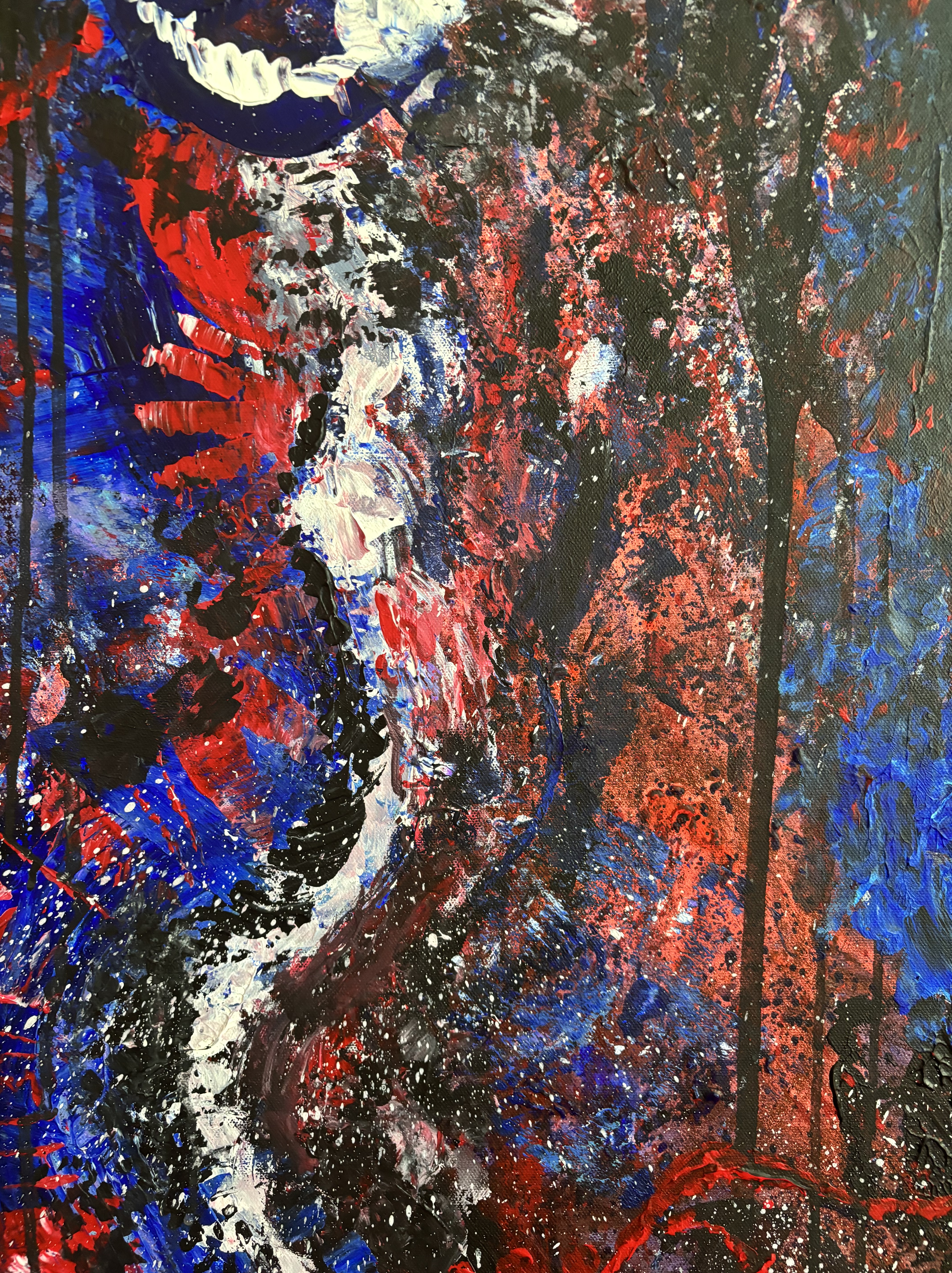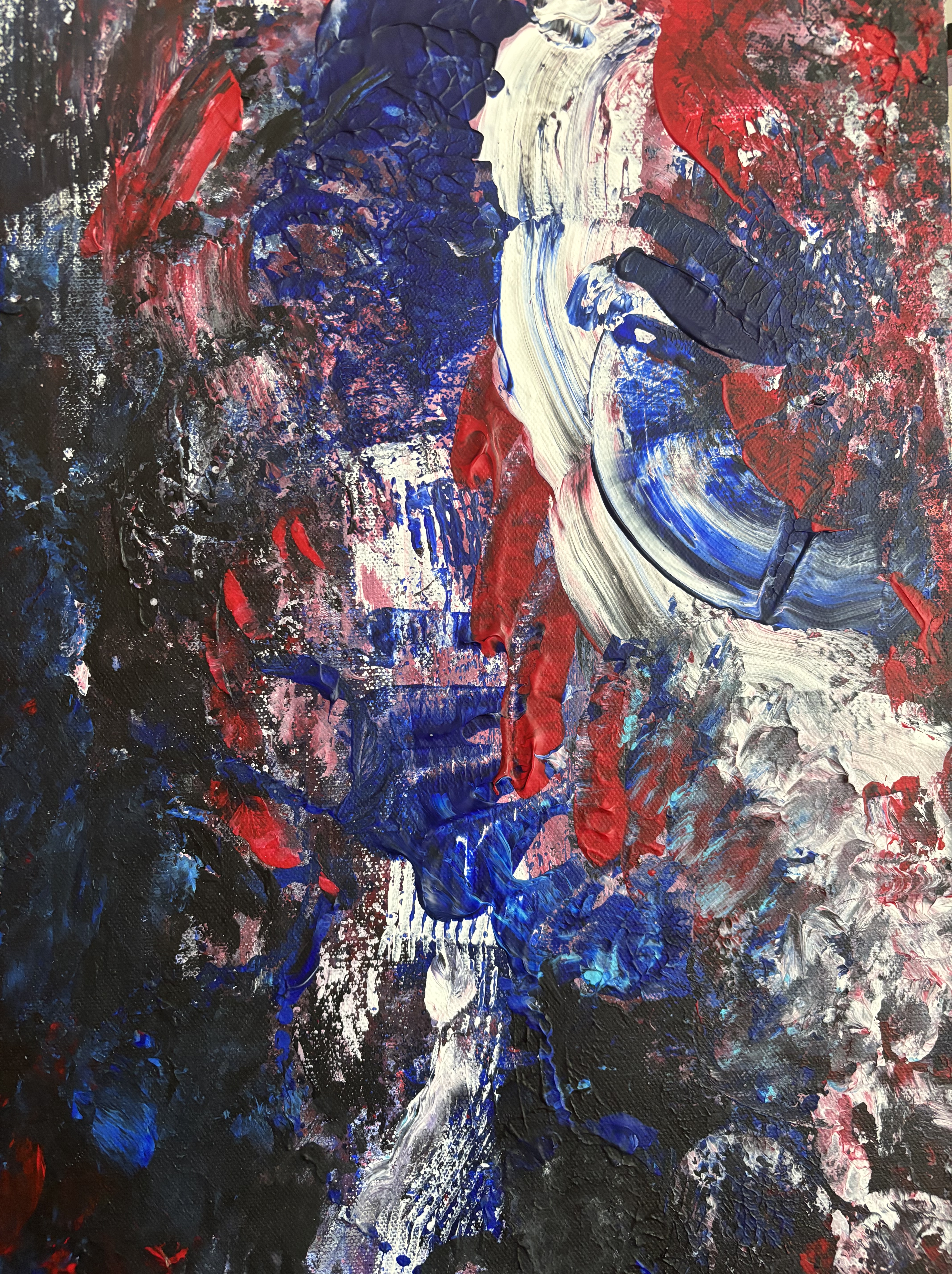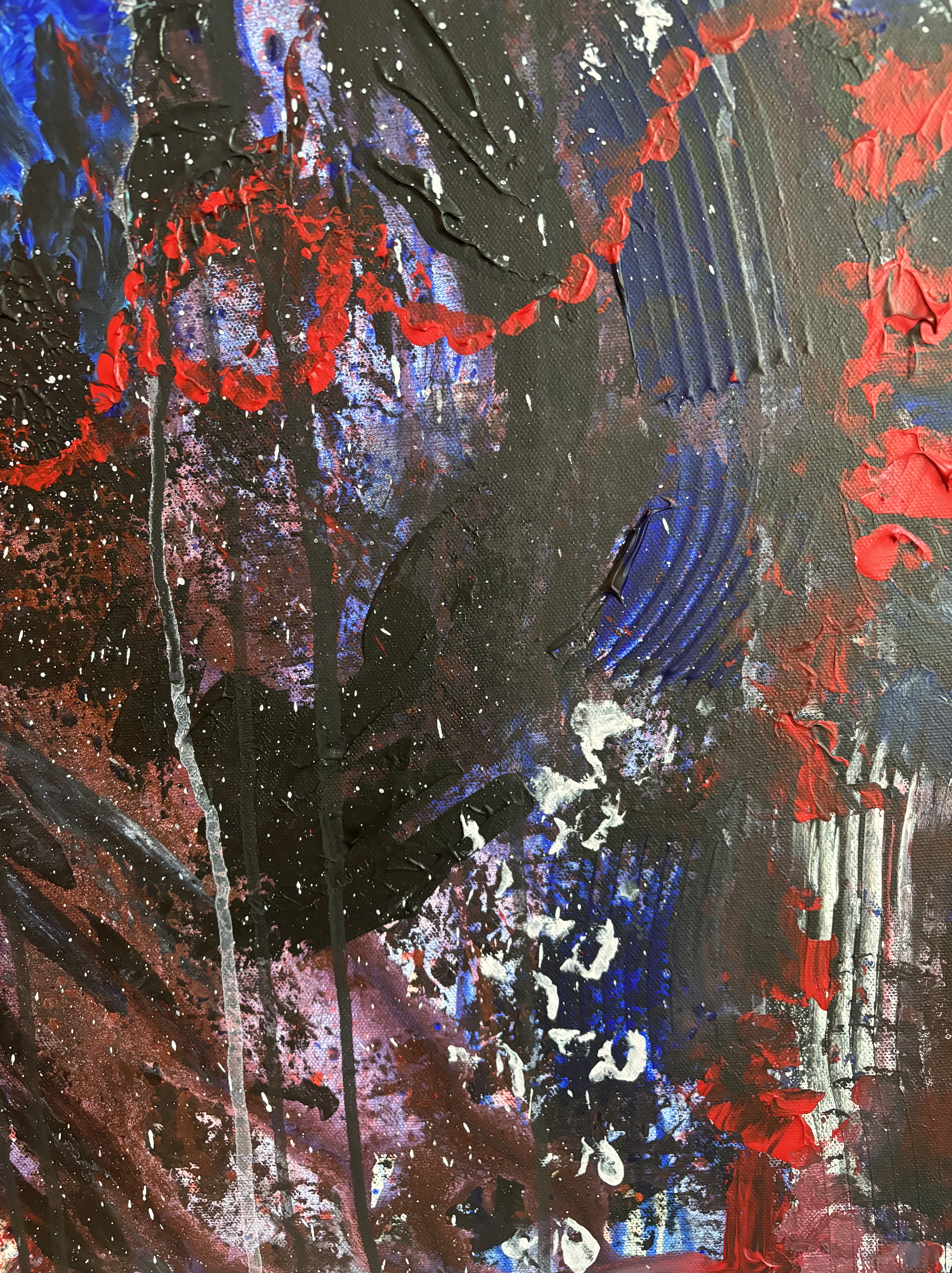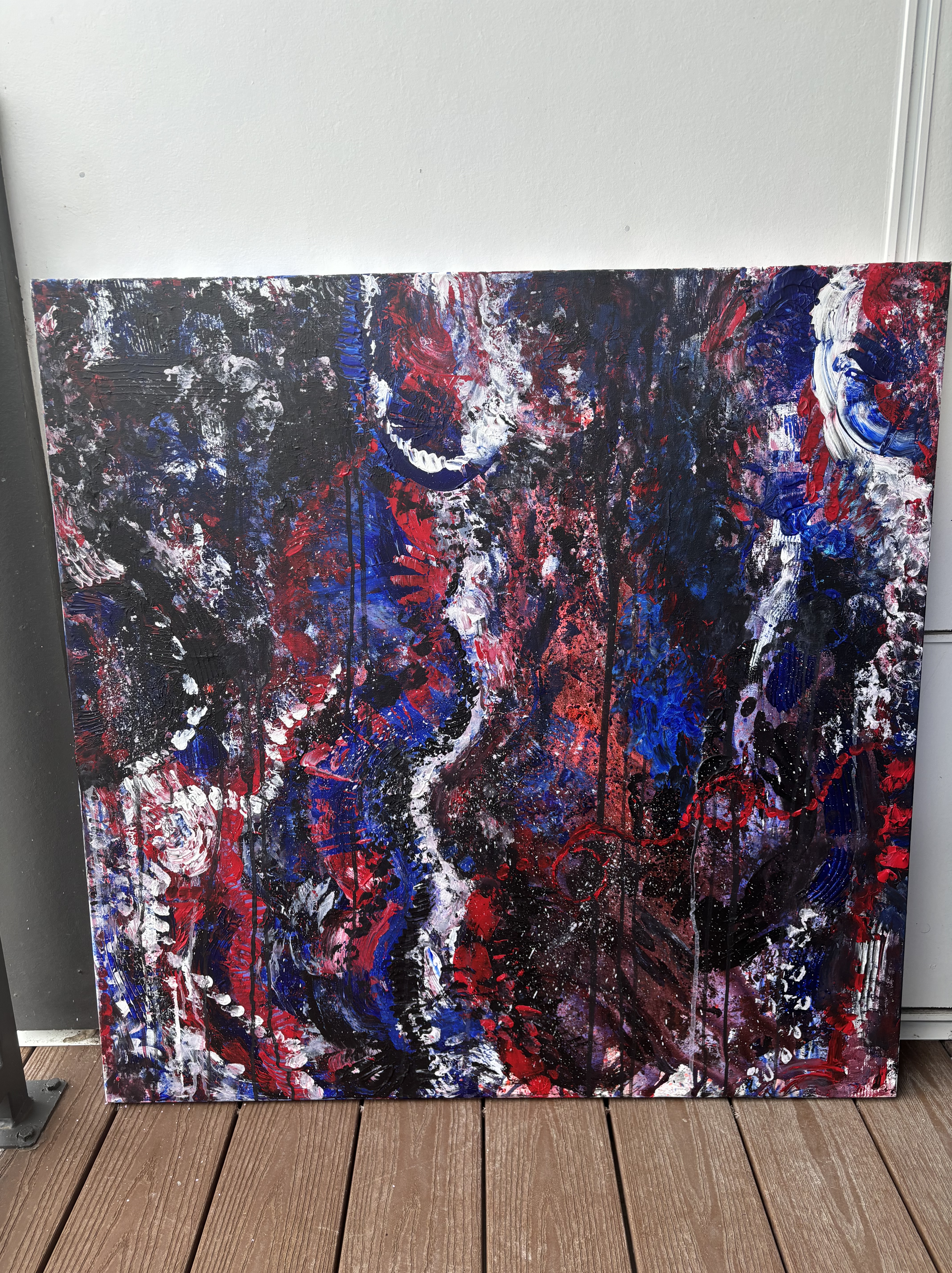 I’d say this piece is raw power without a filter — it feels like it was painted in a moment where the goal wasn’t beauty but release. There’s something primal and expressive about it as if it wasn’t made with the mind but with the nervous system. There’s no clear focal point, which feels disorienting, but the more you sit with it, the more it mimics a panic spiral or an emotional storm. Your eyes are forced to dart, scan, search — but they never settle. And I don’t think it was a conscious decision made in the moment.