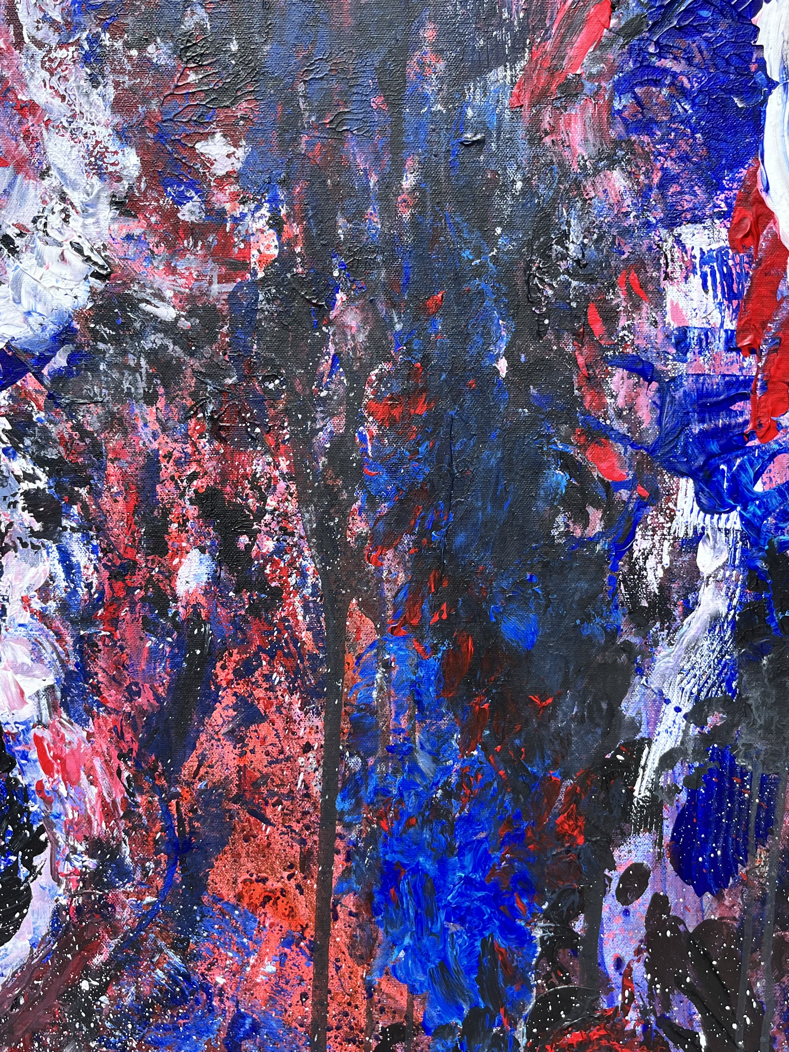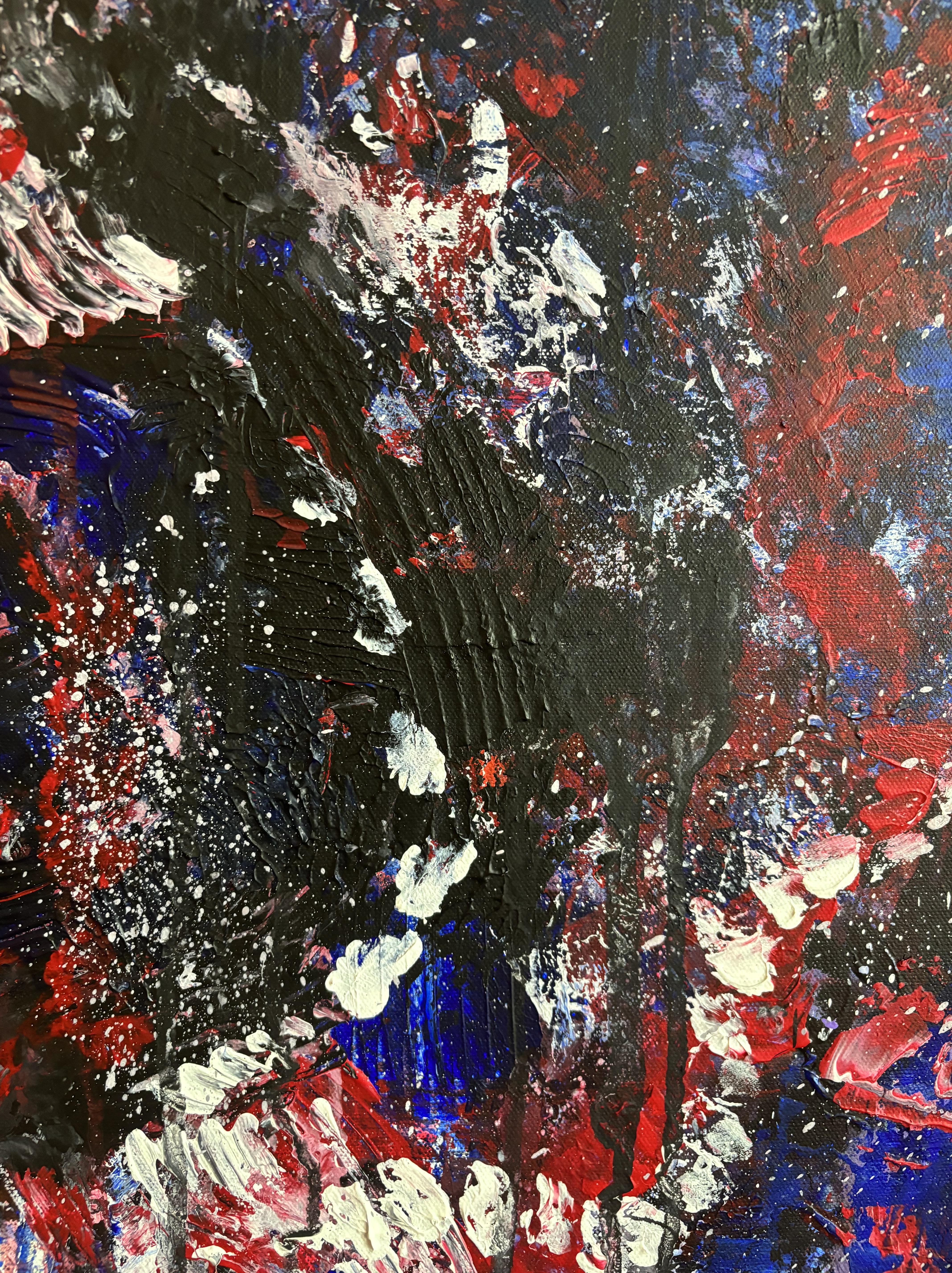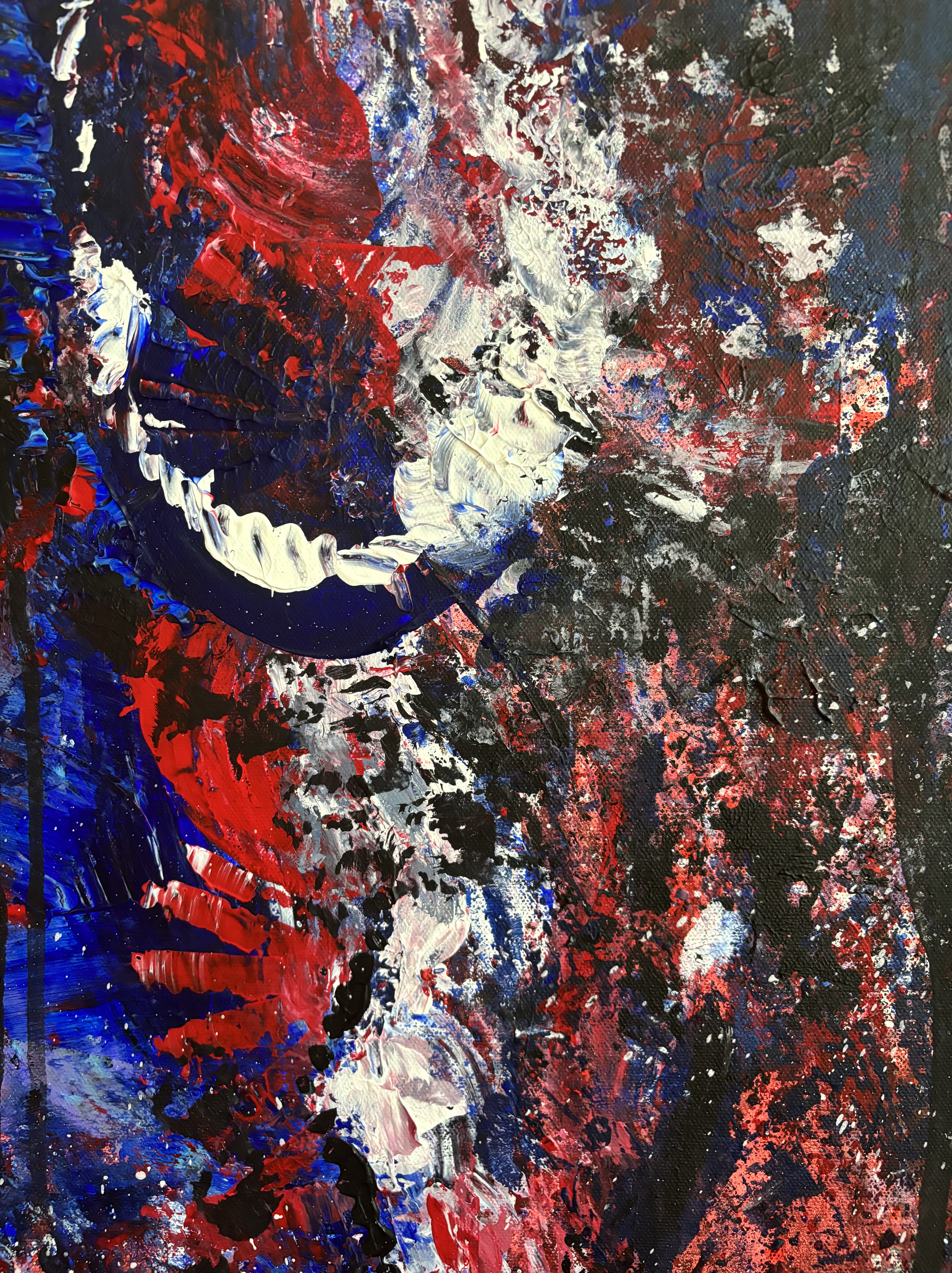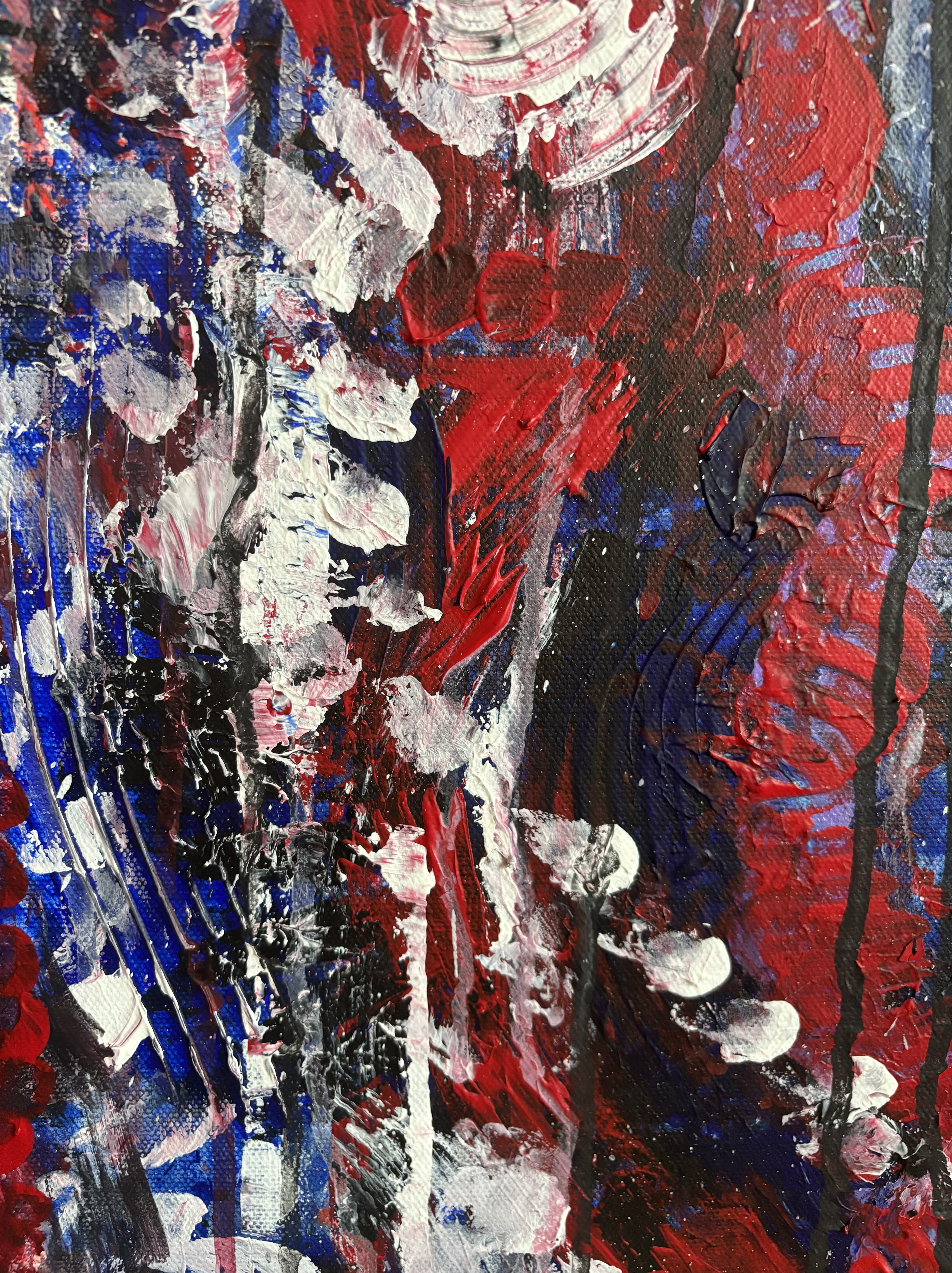 I’d say this piece is raw power without a filter — it feels like it was painted in a moment where the goal wasn’t beauty but release. There’s something primal and expressive about it as if it wasn’t made with the mind but with the nervous system. There’s no clear focal point, which feels disorienting, but the more you sit with it, the more it mimics a panic spiral or an emotional storm. Your eyes are forced to dart, scan, search — but they never settle. And I don’t think it was a conscious decision made in the moment.